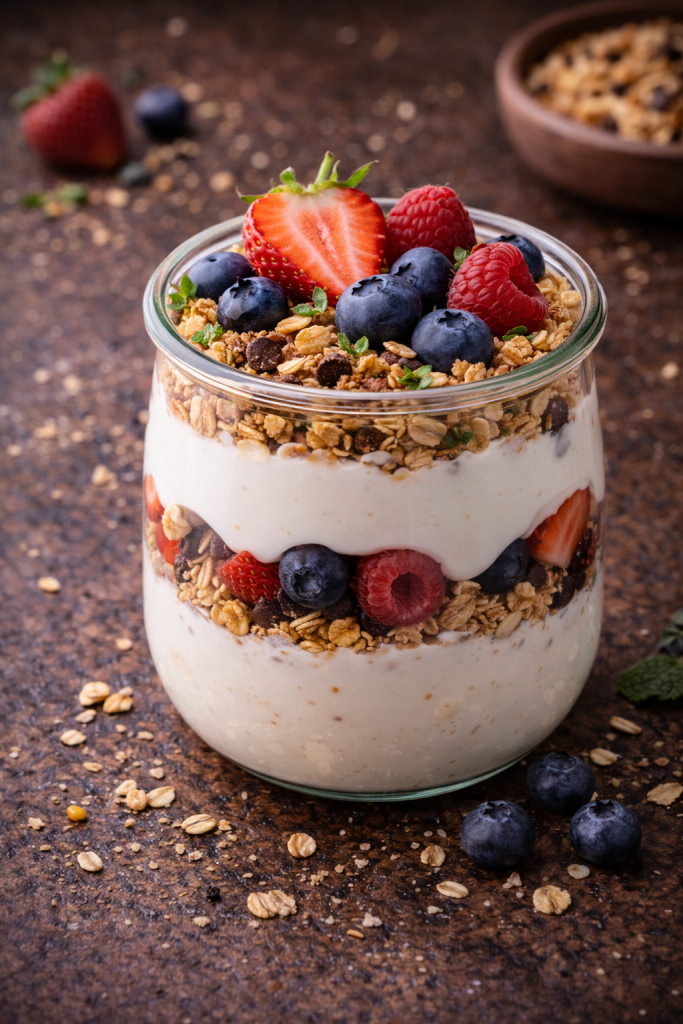 Opt for plain Greek yoghurt for a higher protein content, and layer it with fruits like berries, mango, or banana, along with chia seeds, flaxseeds, or a sprinkle of granola.
