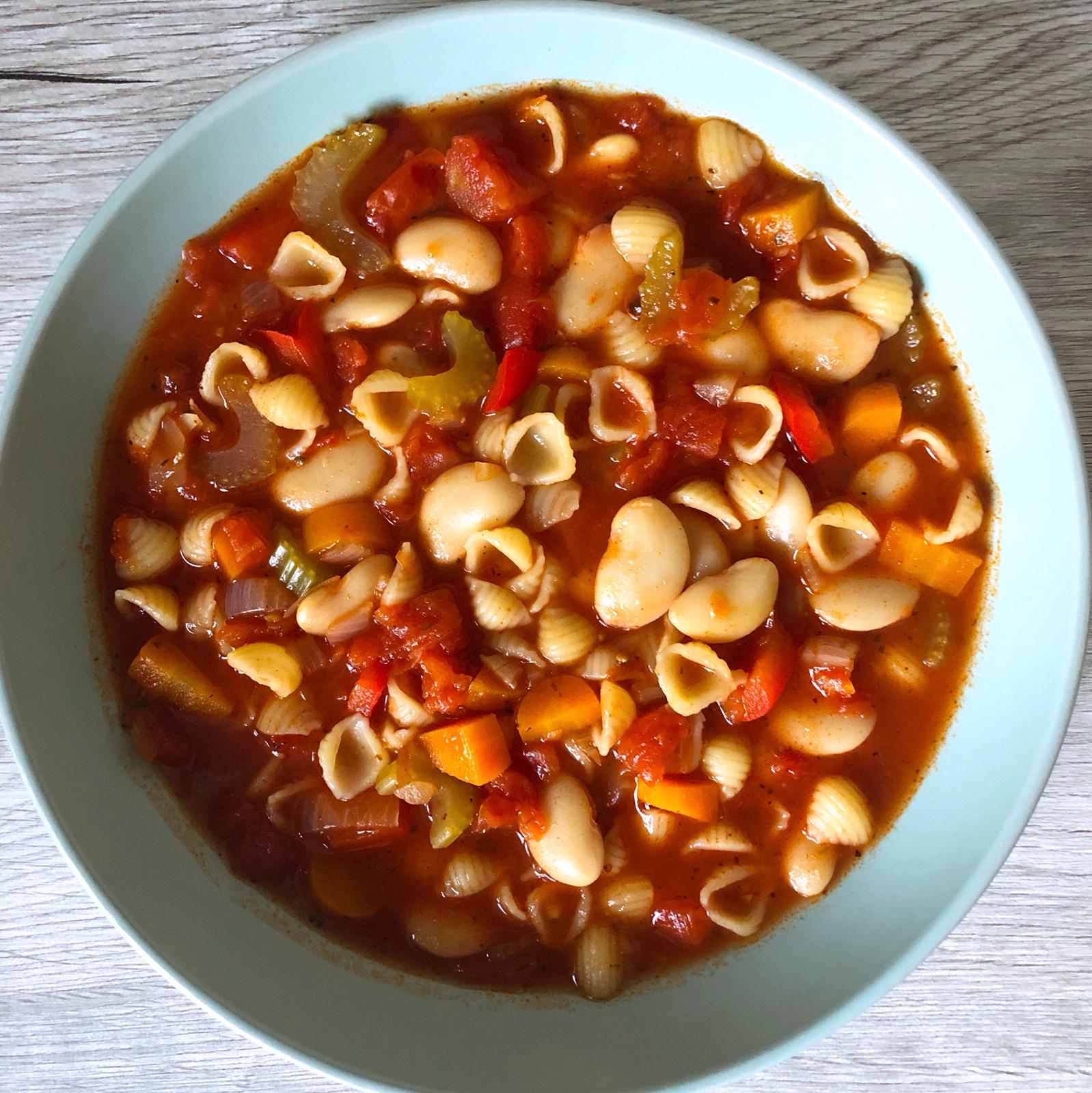 - Add the drained butterbeans, tin tomatoes, soup pasta and 500-600ml of water. Simmer for 8-10 minutes, or until the pasta is cooked.